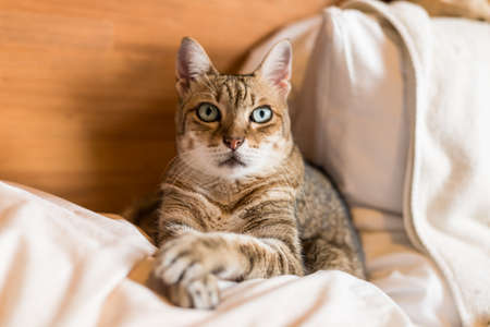 Abyssinian cat at home. Close up portrait of blue abyssinian cat, lying on a patchwork quilt and pillows. Pretty cat, white background. Cute resting kitty, selective focus. Yellow eyes, big ears cat