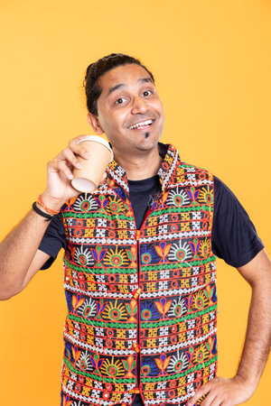 Portrait of radiant man sipping fresh coffee from cardboard cup early in the morning to wake up and be energized. Jolly person drinking hot beverage, having positive facial expression