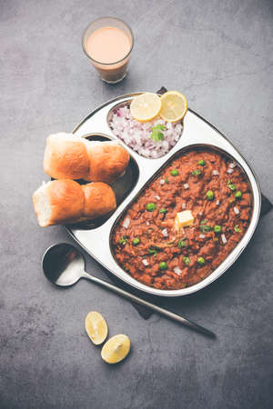 Mumbai Style Pav bhaji is a fast food dish from India, consists of a thick vegetable curry served with a soft bread roll, served in a plate