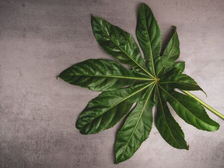 Leaf pattern. Popular plant in interior design, Green beautiful tropical leaves on gray concrete background. Summer concept. Flat lay, top view, copy space