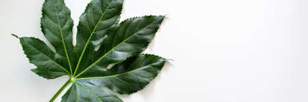 Panoramic photo of white background copy space with green leaf