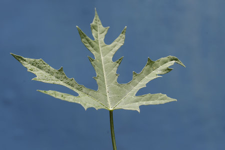 Papaya leaf on a blue background, closeup of photo