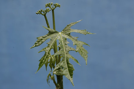 Papaya plant on blue background. Papaya is a genus of flowering plants in the family Papaveraceae.