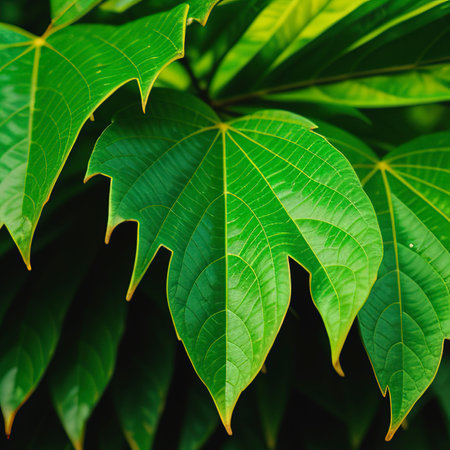 Close-up shot of a Japanese Aralia plant, showcasing the intricate details and vibrant green hues of its unique leaf structure. Ideal for adding a touch of natural elegance to any creative project.