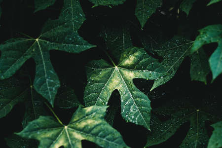 Close-up of three-lobed green leaves. Overlapping each other to form a bush of leaves.
