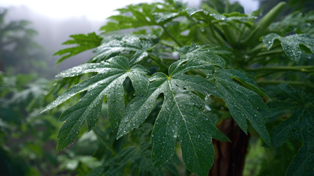 Close-up of a papaya leaf with glistening water droplets, highlighting its intricate patterns and vibrant green color.