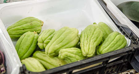 Green ripe Chayote Sechium edule fruit, mirliton and choko, gourd family, Cucurbitaceae on farmers market on Fuertevantura, Spain