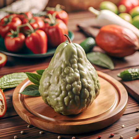 A close up 3D illustration of a chayote. a unique and delicious squash variety. on a wooden cutting board. Perfect for culinary. health. or botanical projects!