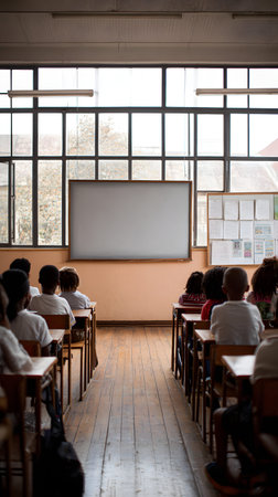 A bright classroom bathed in natural light, featuring wooden desks, a chalkboard, and colorful decorations, perfect for fostering a creative learning experience.
