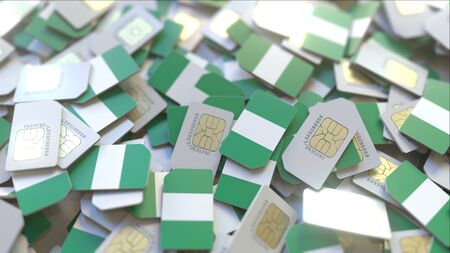 Many SIM cards with flag of Nigeria, Nigerian mobile telecommunications related 3D rendering