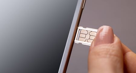 Close-up Of Nano Sim Card Ready To Insert In Smart Phone Over The Desk