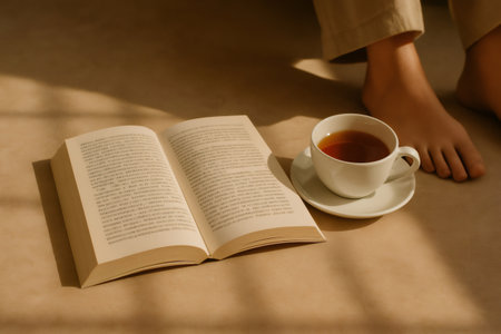 Open book rests beside a cup of tea, bathed in warm sunlight filtering through a window, creating a cozy atmosphere for reading and relaxation