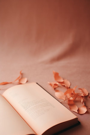 An open book on a table with some leaves around it, AI