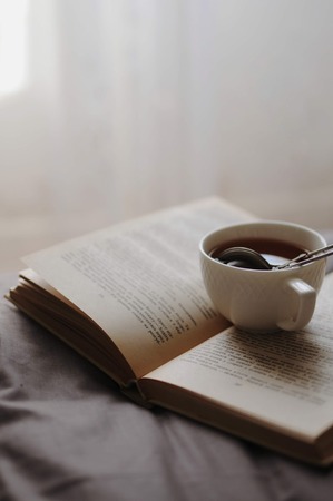 Cozy home still life: cup of hot tea with sieve and opened book on grey bed. The concept of coziness and reading. Relaxing morning. Winter holidays, free copy space