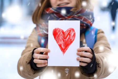 A drawn heart on a paper sticker. Heart on the paper in his hand. A symbol of love and unity. Natural soft light with shadows. Creative layout of a Valentine's day greeting card. Copy space