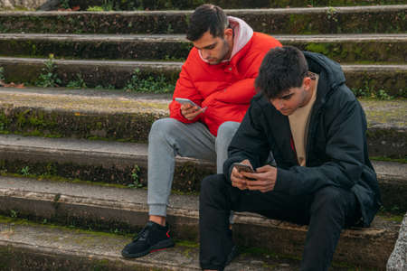 young people with mobile phone sitting on the stairs