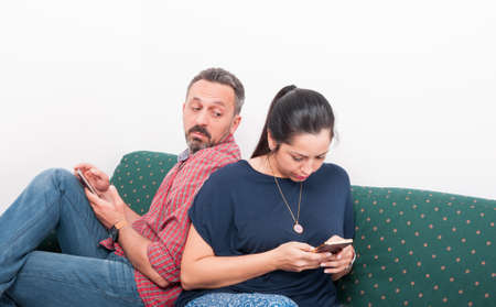 Curious male sitting on couch and looking at woman phone as jealousy concept