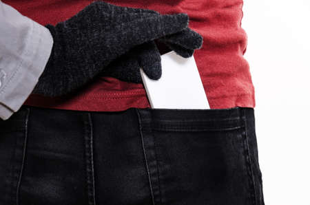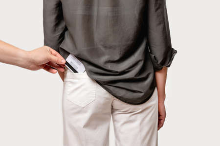 Bank fraud. Financial crime. Personal data security. Electronic transaction risk. Male thief hand stealing credit card from woman back pocket isolated on light neutral copy space background.
