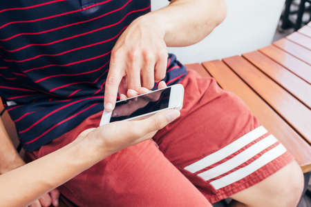 Close up of men and woman hands holding touching mobile phone with blank copy space for your text message in cafe with light Sunset,Vintage tone.Selective focus