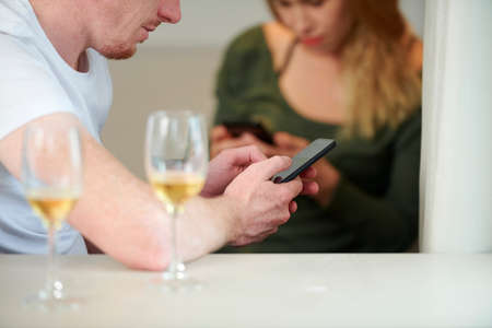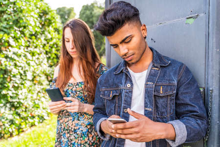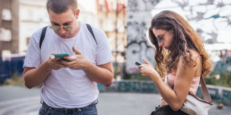 Young couple using smartphones together. People addiction to new technology trends. Youth, new generation internet friendship concept. Emotional isolation and depresion