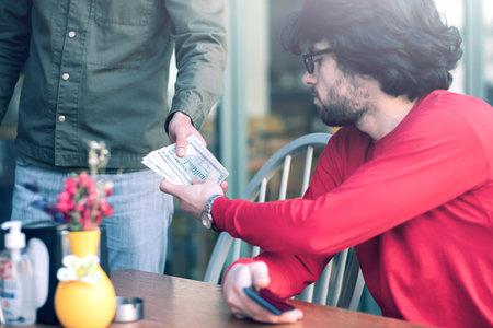 man hands money to another man. man sitting in the cafe gives money to another man