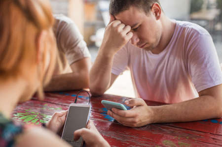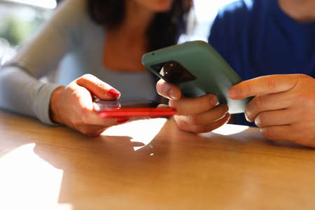 Man and woman are sitting in cafe and looking at smartphones