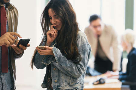 Colleagues using smartphone in office