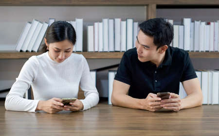 Young Asian male and female working together on the wooden table with laptop, looking at their mobile phones with a bookshelf in the background.