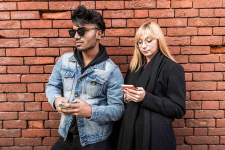 young multi-ethnic couple in front of brick wall using smartphone to share content on social networks