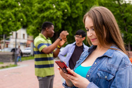 Three beautiful young women walk in the city, using phone outdoors