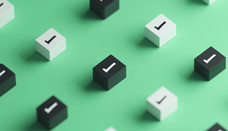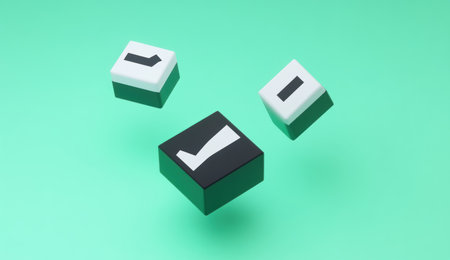 Cute, simple isometric shapes, checkmark icons floating on a green background, minimalistic, black and white, 3D render, flat design, vector graphic, simple shadows, no gradients. --ar 26:15 --v 6.1 Job ID: cb273074-9deb-4707-9b8b-69dc675e6f84