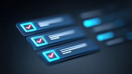 This image showcases futuristic user interface elements featuring glowing checkmarks, set against a dark background, perfect for technology-themed projects.
