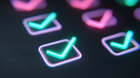 Bright and colorful neon checkmark icons illuminated against a dark background offer a modern take on confirmation and approval concepts for various uses.