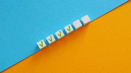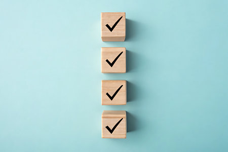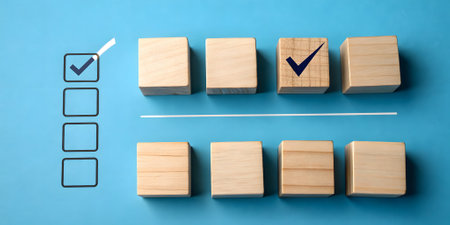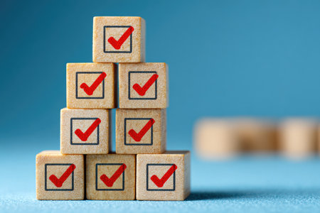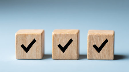 Wooden blocks with checkmark symbols on a light blue background representing success, approval, validation, and positive outcomes in various contexts