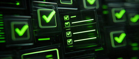 A sleek, advanced digital dashboard displaying luminous green ticks inside clear squares, set against a sophisticated grid pattern signifying seamless workflow valid
