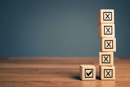 Right or good decision making concept. Check mark symbol and wrong or cross icon on wooden cubes