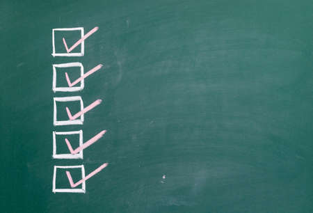 Check boxes with a red tick written with chalk on a smudged blackboard