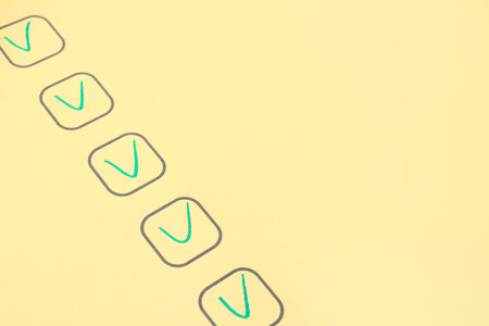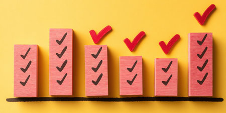 A hand holds a pen poised over a neatly drawn checklist, with several boxes ticked off in red ink, symbolizing progress and accomplishment. Surrounding the checklist are vibrant yellow blocks, a sleek pen, and a potted plant, creating a harmonious workspace that inspires motivation and focus.