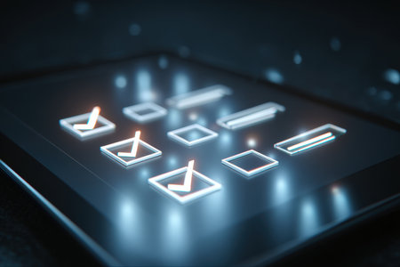 A individual taps vibrant, luminous checkmarks on a sleek digital display, capturing the essence of modern tech approval and seamless verification processes.