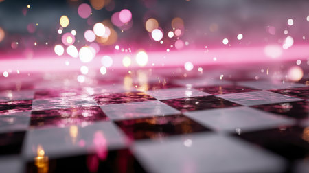 A mesmerizing close-up reveals a glossy checkerboard pattern shimmering under vibrant, out-of-focus lights and soft pink glows, evoking a lively and enchanting celebration ambiance