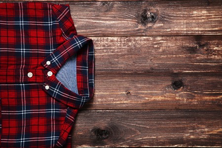 Red tartan shirt folded on white wooden background