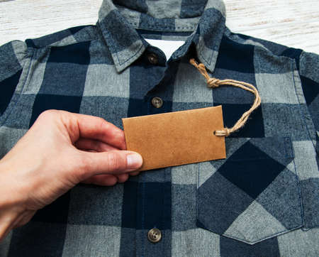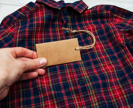 Checkered shirt on a table with tag
