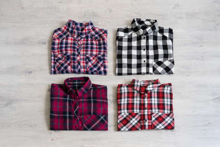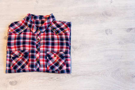 Plaid shirt folded on white wooden background