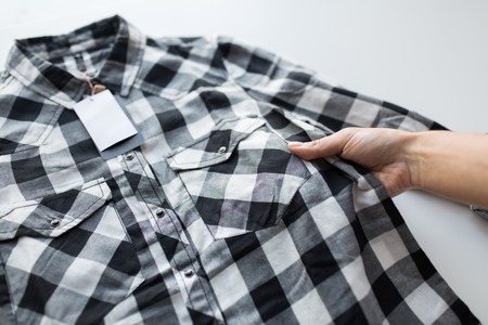 close up of hand and shirt with price tag
