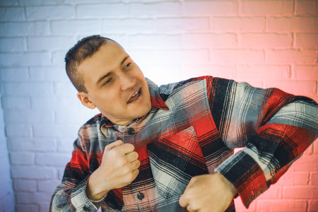 Man in Plaid Shirt Dancing in Front of a Brick Wall.