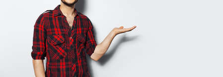 Close-up of male hand pointing on copy space, demonstrate or presenting concept, panoramic banner view on white background.