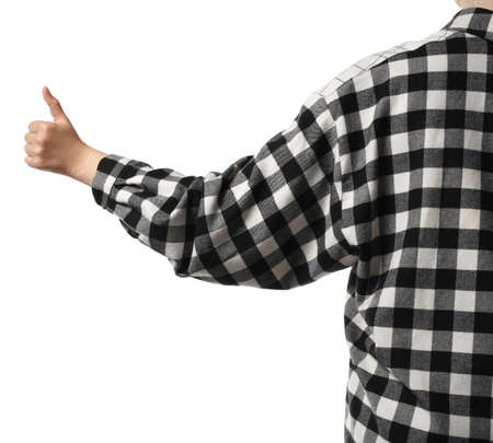 Woman showing hitchhiking gesture on white background, closeup