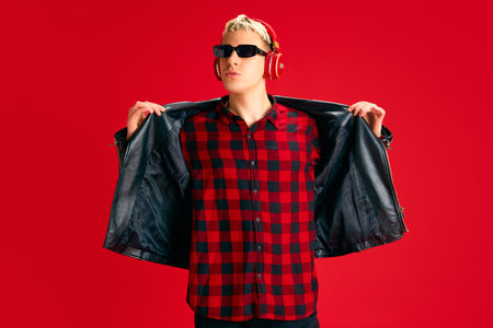 Stylish young man in checkered shirt, sunglasses and leather jacket standing and listening to music in headphones against red studio background