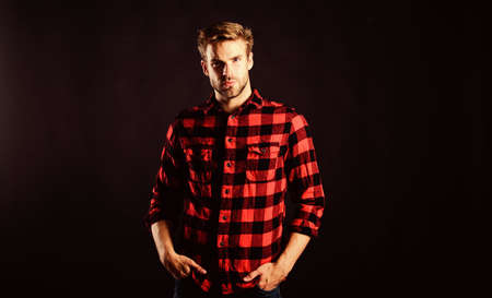 Barbershop and beauty salon. Hipster black background. Standards of manliness or masculinity. Handsome well groomed man in checkered shirt. Manliness concept. Meaning of modern manliness. Male beauty