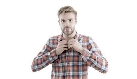 Manhood. Macho man wearing checkered shirt. Male fashion summer trends. Unshaven man skin care. Barbershop concept. Sexy guy casual style. Masculinity concept. Man beauty model. Menswear shop
